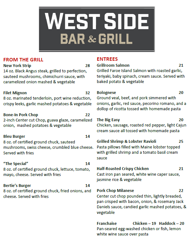 Welcome to West Side Bar & Grill, a must-visit dining spot nestled in West Springfield, MA. Their menu is a culinary delight, featuring a range of tantalizing starters and hearty entrees that cater to diverse palates.